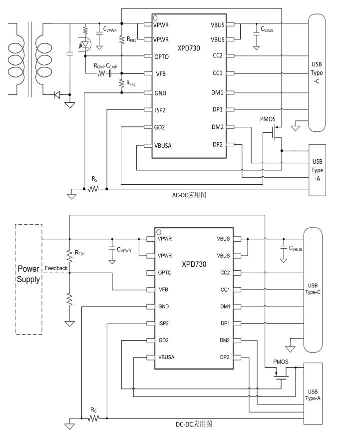 XPD730 A加C双口协议识别芯片通过一路可 Sink/Source 的电流源,连接到 AC-DC 或 DC-DC 的反馈引脚实现动态调节电压。不管是启动还是调压过程,都具备软启动功能,实现电压平顺过渡。