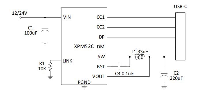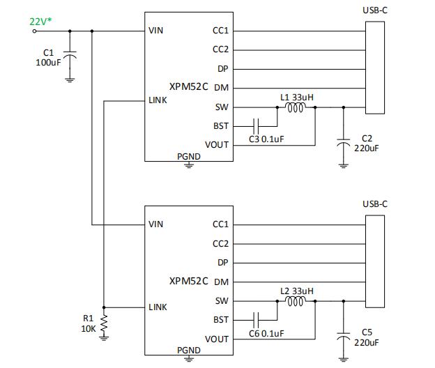 *注意:用两颗 XPM52C 组成双 C 口方案时,推荐输入工作电压为 22V,可提高转换效率。