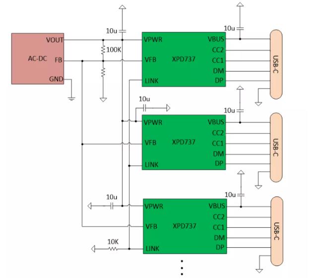 XPD737多口控制器系列采用ESOP8封装,内部集成 10mΩ VBUS 通路管,并且集成10mΩ电流检测电阻,支持完善的保护功能,具有XPD-LINK功能,XPD-LINK互联技术让芯片之间通过单线总线传输信息,从而可以简单灵活的组合成多个Type-C和Type-A端口的充电方案,降低外围元件数量,简化电路,降低成本。