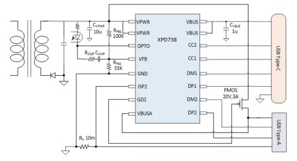 XPD738双口控制器系列,应用在1C1A双端口充电设备,在A口连接苹果充电线但未接入苹果手机时,C口仍然有快充。XPD738秉承云矽全集成设计思路,也集成了10mΩ VBUS通路功率开关管和10mΩ电流检测电阻。对于1C1A 20W配置的充电设备,XPD738是当之无愧的不二之选。