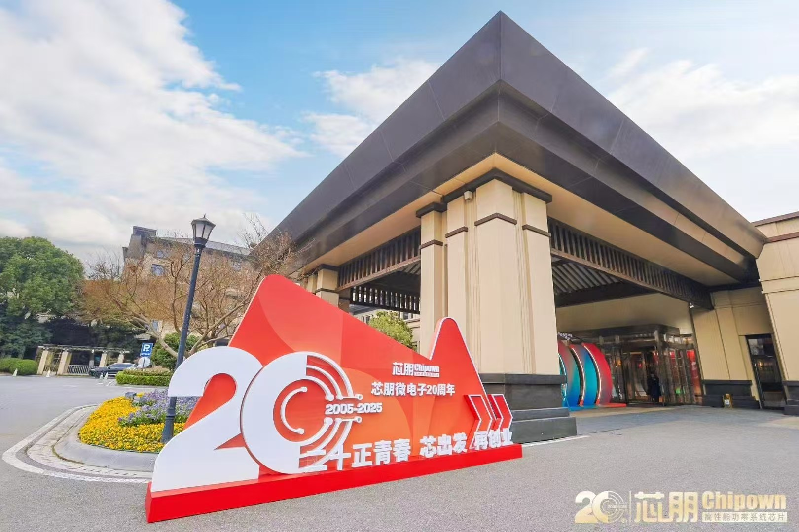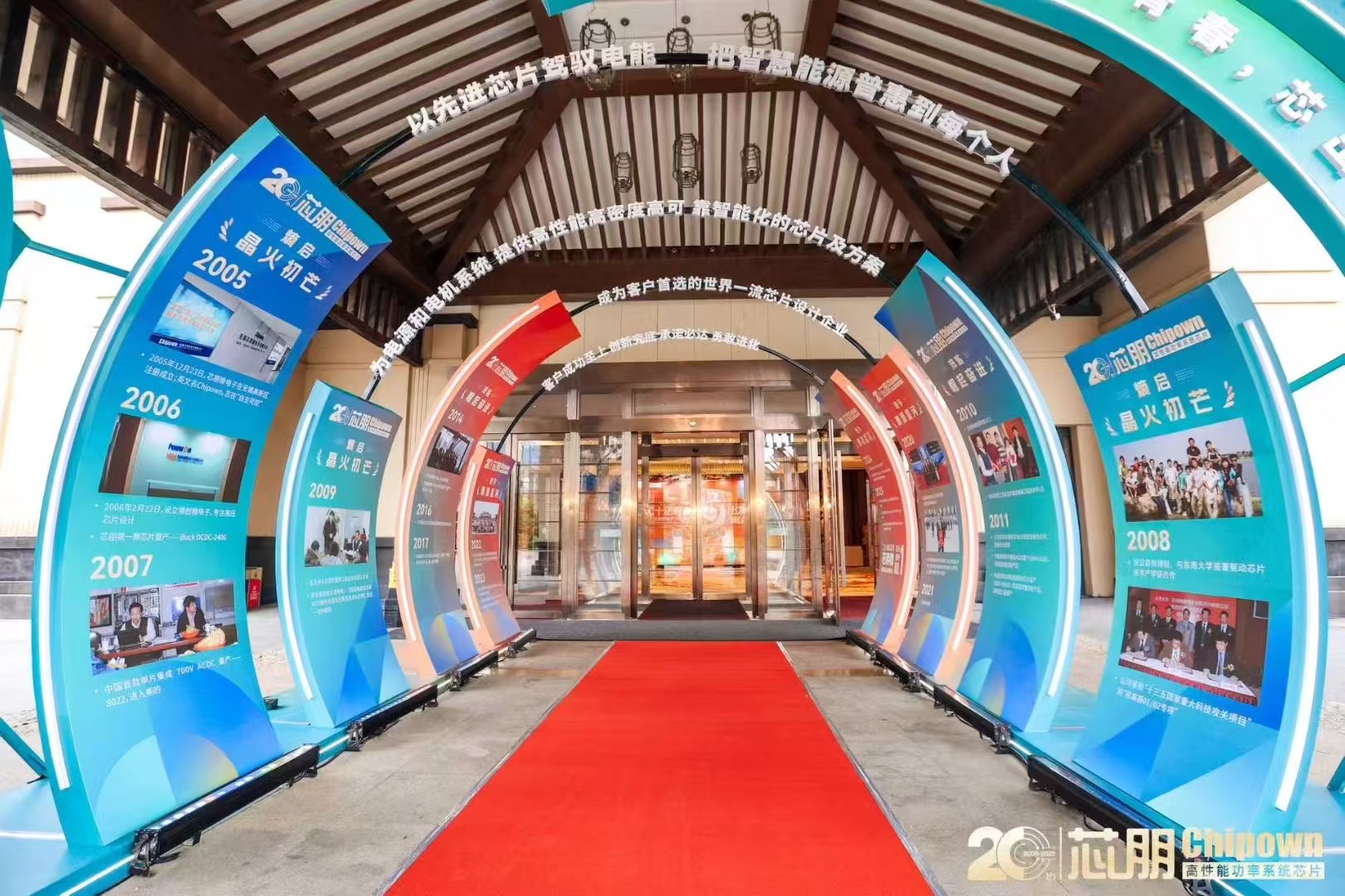 踏入庆典会场,“二十正青春,芯出发,再创业” 的主题氛围扑面而来。入口处的巨型展板融合了芯片纹理与青春元素,既彰显芯朋微深耕功率半导体的科技基因,又传递出二次创业的蓬勃朝气。