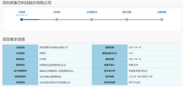 据上海证券交易所信息显示,6月10日深圳英集芯科技股份有限公司科创板IPO上市申请已获受理。