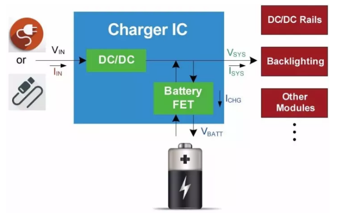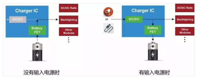 充电IC是基于电池和系统负载之间的连接方式的不同,系统负载可以由输入电源供电,也可以由电池供电,或者由两者同时供电。那么电池IC就必须具备功率管理功能,来实现系统负载功率来源的选择。