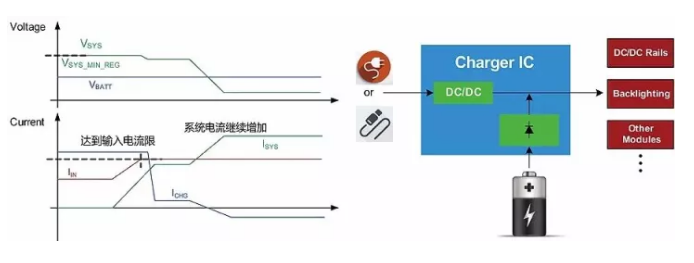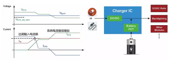 在以上的充电过程中,当总的系统负载需求超过输入电源的能力时,系统母线电压会下跌,充电IC就会减少充电电流以保证总的负载功率不再继续增加,从而稳定系统电压不再下跌,维持系统负载的平稳运行。