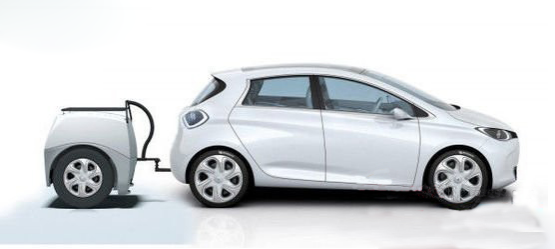 法国一家公司专门为汽车研发了一个充电宝——EP Tender. 该装置以外挂的形式连接在电动车后面,在汽车行驶时,EP Tender内置发动机就会随着车轮转动产生电力,然后传送到电动车内。