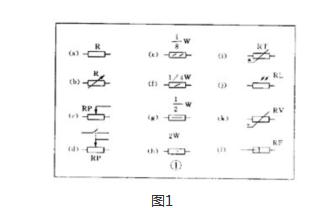 符号详见图1所示,其中(a)表示一般的阻值固定的电阻器,(b)表示半可调或微调电阻器;(c)表示电位器;(d)表示带开关的电位器。电阻器的文字符号是“R”,电位器是“RP”,即在R的后面再加一个说明它有调节功能的字符“P”。在某些电路中,对电阻器的功率有一定要求,可分别用图1中(e)、(f)、(g)、(h)所示符号来表示。还有几种特殊电阻器的符号,第1种是热敏电阻符号,热敏电阻器的电阻值是随外界温度而变化的。有的是负温度系数的,用NTC来表示;有的是正温度系数的,用PTC来表示。它的符号见图(i),用θ或t°来表示温度。它的文字符号是“RT”。第2种是光敏电阻器符号,见图1(j),有两个斜向的箭头表示光线。它的文字符号是“RL”。第3种是压敏电阻器的符号。压敏电阻阻值是随电阻器两端所加的电压而变化的。