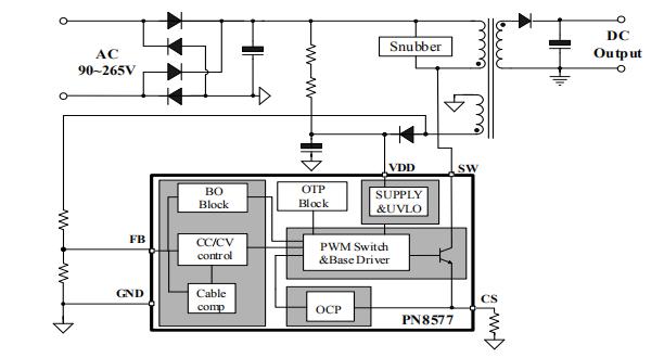 PN8577是一款高性能的原边反馈控制器。PN8577工作在原边检测和调整模式,可省略系统的光耦和TL431。PN8577拥有恒压恒流控制环路,可以实现高精度的恒压、恒流输出,以满足大部分充电器和适配器需求。PN8577极低的芯片功耗使得系统能够满足较高的待机功耗标准。