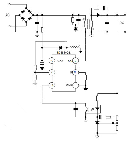 SD8666QS 具有抖频功能,以降低EMI。具有峰值电流补偿功能,在不同的AC 输入电压下能保持极限输出功率一致。还有软启动功能,在上电过程中减小器件应力。